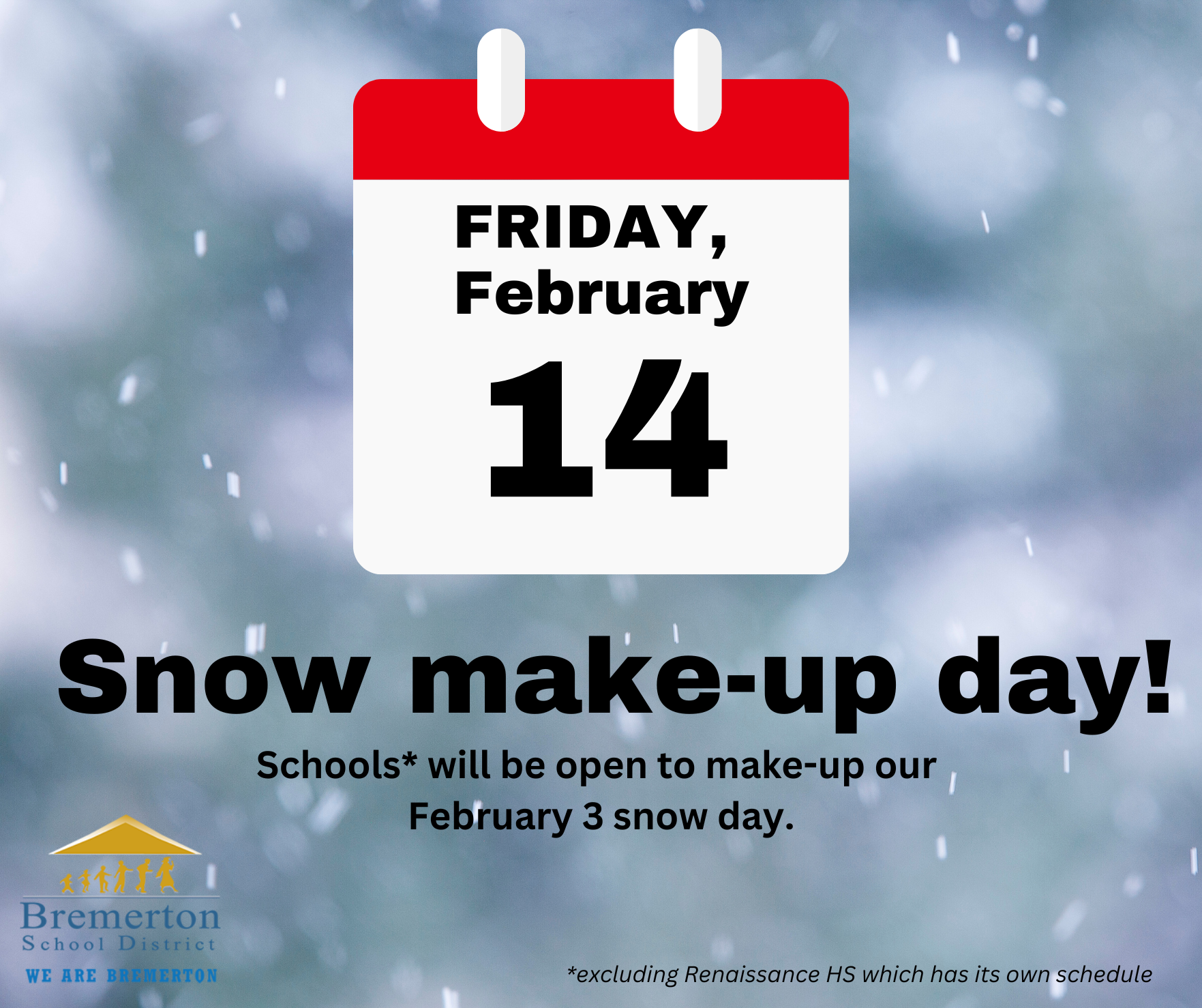 Due to the cancellation of school today (Feb. 3), Friday, February 14 will be a snow makeup day. All schools* will be open for a regular school day on Friday, February 14. There is only one more snow make-up day on the 2024-25 calendar (May 23) that may need to be utilized if there are any more weather-related closures.