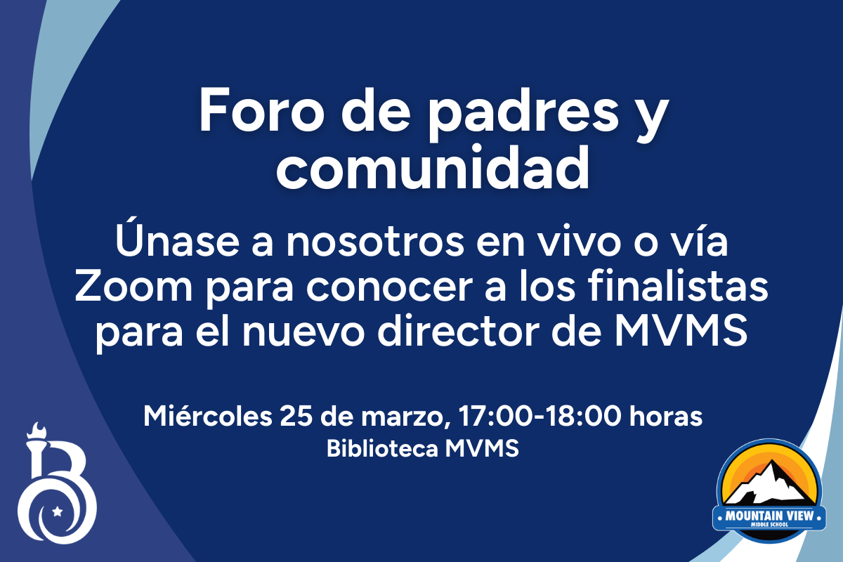 We have rescheduled the Parent & Community form with the finalists for the new MVMS Principal. We hope you will save the date and join us on Wednesday, March 25! This forum will be in-person and on Zoom!